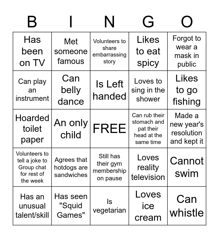 This bingo card has a free space and 27 words: Loves reality television, Likes to play football, Loves to sing in the shower, Is vegetarian, Can play an instrument, Volunteers to share embarrassing story, Met someone famous, Volunteers to tell a joke to Group chat for rest of the week, Can rub their stomach and pat their head at the same time, Cannot swim, Hoarded toilet paper, Likes to eat spicy, Has an unusual talent/skill, Has seen "Squid Games", Likes to go fishing, Has lived in another country, Can belly dance, Is Left handed, Agrees that hotdogs are sandwiches, Has been on TV, Made a new year's resolution and kept it, Loves ice cream, An only child, Can whistle, Still has their gym membership on pause, Forgot to wear a mask in public and Had cereal for breakfast.