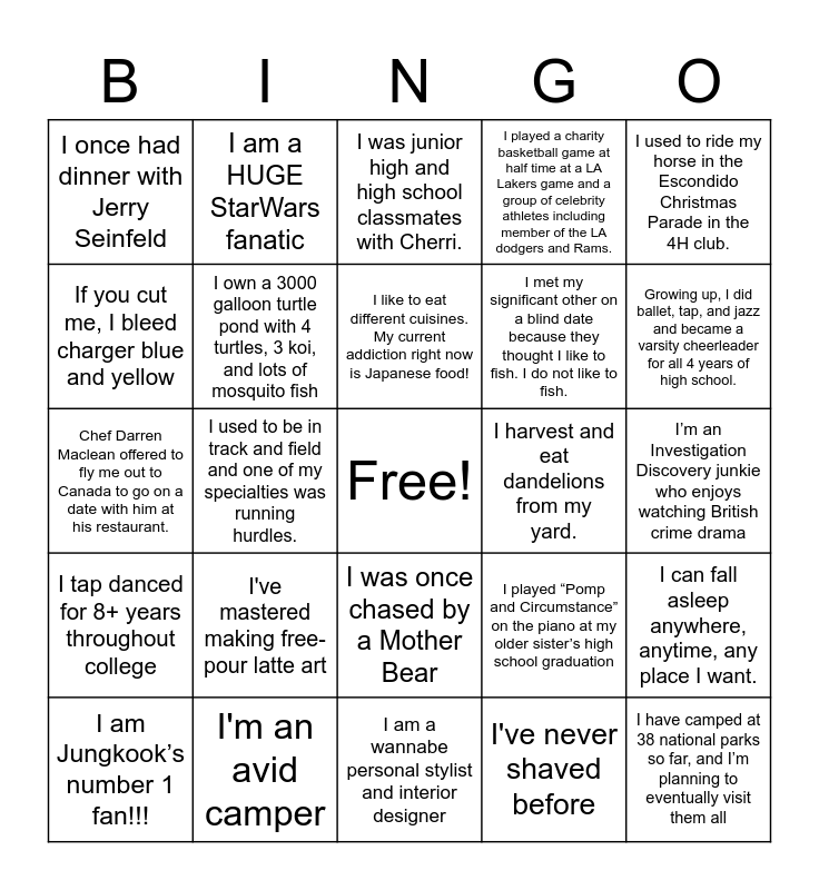 This bingo card has a free space and 35 words: I am a partial owner of a ranch in San Luis Potosi, Mexico, I have titanium rods screwed in my spine, I am afraid of up escalators, I own a 3000 galloon turtle pond with 4 turtles, 3 koi, and lots of mosquito fish, I was once chased by a Mother Bear, I played a charity basketball game at half time at a LA Lakers game and a group of celebrity athletes including member of the LA dodgers and Rams., If you cut me, I bleed charger blue and yellow, If I didn’t go into Pharmacy, I would have gone into International Business or become a food critic, I like to eat different cuisines. My current addiction right now is Japanese food!, I have never been hospitalized., Chef Darren Maclean offered to fly me out to Canada to go on a date with him at his restaurant., I used to ride my horse in the Escondido Christmas Parade in the 4H club., I love studying stories and mythologies from around the world across all time periods, I was a competitive baton twirler from age 4 until the age of 14., I once had dinner with Jerry Seinfeld, I harvest and eat dandelions from my yard., I've never shaved before, I used to be in track and field and one of my specialties was running hurdles., I tap danced for 8+ years throughout college, I have camped at 38 national parks so far, and I’m planning to eventually visit them all, I played “Pomp and Circumstance” on the piano at my older sister’s high school graduation, I am Jungkook’s number 1 fan!!!, I can fall asleep anywhere, anytime, any place I want., I'm an avid camper, I was junior high and high school classmates with Cherri., Growing up, I did ballet, tap, and jazz and became a varsity cheerleader for all 4 years of high school., I started 1st grade when I was 10 years old., I have 3 nephews who are 2, 4, and 6 years younger than me., I met my significant other on a blind date because they thought I like to fish. I do not like to fish., I’m an Investigation Discovery junkie who enjoys watching British crime drama, My middle “name” is only a single letter, I am a wannabe personal stylist and interior designer, I've mastered making free-pour latte art, I am a HUGE StarWars fanatic and I was suspended from high school for 3 days..