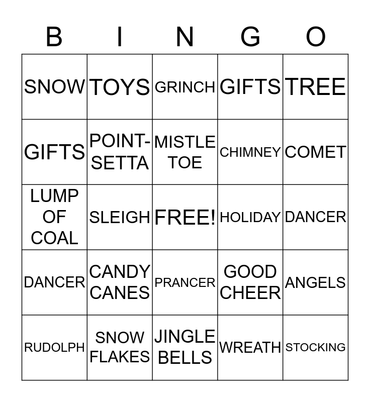 This bingo card has a free space and 24 words: CANDY CANES, SNOW FLAKES, MISTLE TOE, RUDOLPH, TREE, SNOW, GIFTS, TOYS, HOLIDAY, PRANCER, CHIMNEY, LUMP OF COAL, GOOD CHEER, ANGELS, POINT- SETTA, WREATH, DANCER, GRINCH, COMET, SLEIGH, STOCKING, DANCER, GIFTS and JINGLE BELLS.