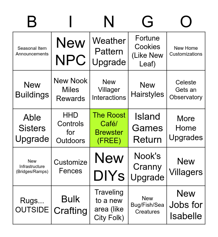 This bingo card has a free space and 24 words: Customize Fences, Bulk Crafting, New Villager Interactions, Rugs... OUTSIDE, New Home Customizations, Seasonal Item Announcements, New Buildings, New NPC, Island Games Return, New DIYs, New Hairstyles, Able Sisters Upgrade, Nook's Cranny Upgrade, New Villagers, New Nook Miles Rewards, New Bug/Fish/Sea Creatures, More Home Upgrades, Weather Pattern Upgrade, Celeste Gets an Observatory, HHD Controls for Outdoors, New Jobs for Isabelle, New Infrastructure (Bridges/Ramps), Fortune Cookies (Like New Leaf) and Traveling to a new area (like City Folk).