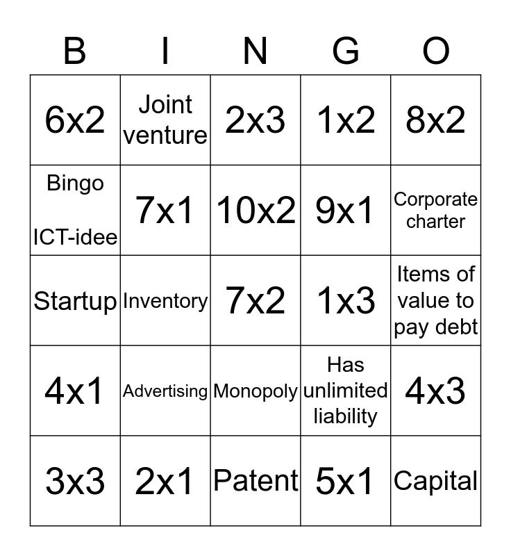 This bingo card has 61 words: 1x1, 2x1, 3x1, 4x1, 5x1, 6x1, 7x1, 8x1, 9x1, 10x1, 1x2, 2x2, Bingo ICT-idee, 4x2, 5x2, 6x2, 7x2, 8x2, 9x2, 10x2, 1x3, 2x3, 3x3, 4x3, 3x2, Corporation, Articles of incorporation, Limited liability, Corporate charter, Stock dividend, Partnership, Entrepreneur, Limited partnership, Sole proprietorship, Joint venture, Franchise, Proprietor, Inventory, Receipts, Startup, Assets, Advertising, Items of value to pay debt, Keeps all profit, Has unlimited liability, Losses are shared, Share all profit, Oldest business organization, Treated by law as a person, Monopoly, Patent, Copyright, Oligopoly, Monopolistic competition, Cartel, Single seller no substitutes, Have a few sellers, Land, Labor, Capital and Record keeping.