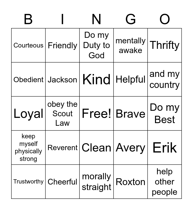 This bingo card has a free space and 24 words: Reverent, Cheerful, Kind, Trustworthy, Thrifty, Courteous, Obedient, Friendly, Brave, Clean, Helpful, Loyal, Avery, Erik, Jackson, Roxton, Do my Best, Do my Duty to God, and my country, obey the Scout Law, help other people, keep myself physically strong, mentally awake and morally straight.