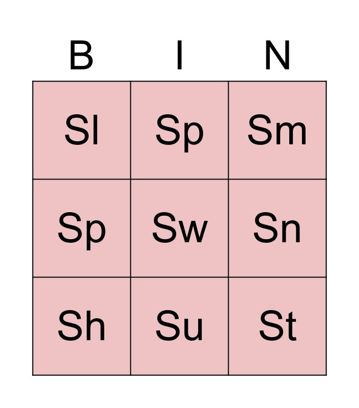 This bingo card has a free space and 8 words: Sn, Sm, Sp, Sh, Sl, St, Sp and Su.