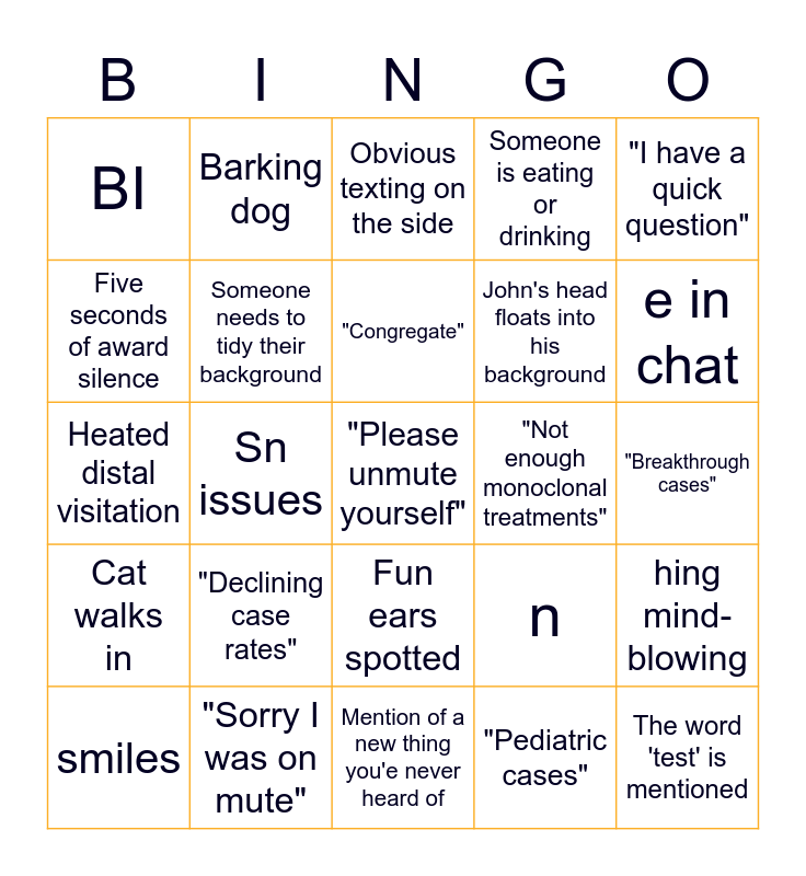 This bingo card has 25 words: "Declining case rates", Mention of a new thing you'e never heard of, "Congregate", smiles, "I have a quick question", BI, Five seconds of award silence, Barking dog, "Not enough monoclonal treatments", Fun ears spotted, John's head floats into his background, Heated distal visitation, n, hing mind-blowing, Someone needs to tidy their background, The word 'test' is mentioned, "Breakthrough cases", Obvious texting on the side, e in chat, Sn issues, "Please unmute yourself", "Sorry I was on mute", Cat walks in, Someone is eating or drinking and "Pediatric cases".