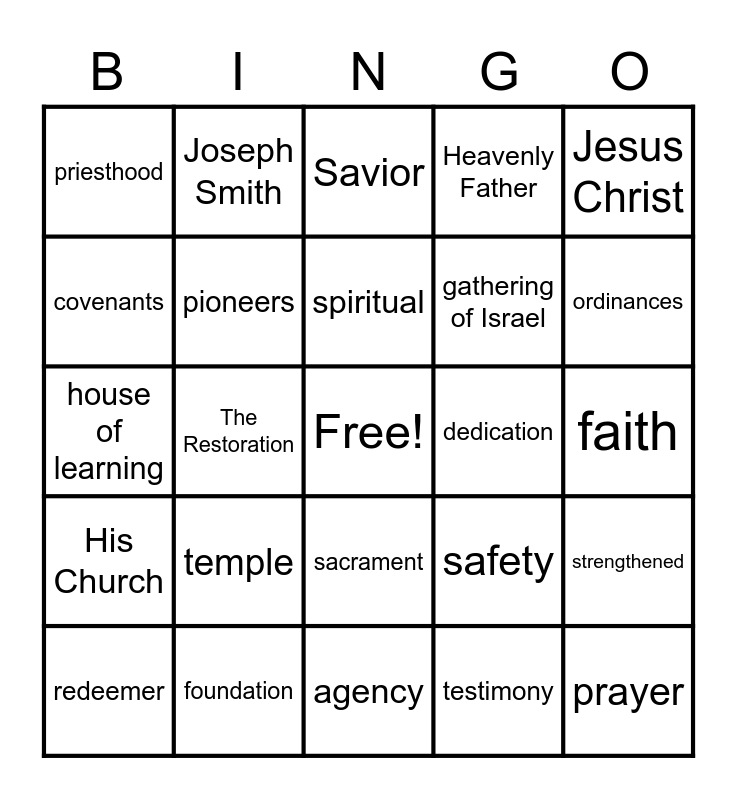 This bingo card has a free space and 24 words: temple, foundation, spiritual, redeemer, Jesus Christ, priesthood, covenants, Joseph Smith, dedication, sacrament, gathering of Israel, house of learning, safety, strengthened, pioneers, testimony, faith, Savior, ordinances, The Restoration, prayer, His Church, Heavenly Father and agency.