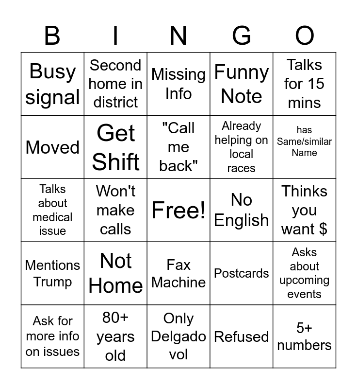 This bingo card has a free space and 24 words: Ask for more info on issues, Not Home, "Call me back", Refused, Talks for 15 mins, Busy signal, Second home in district, Missing Info, No English, Thinks you want $, Talks about medical issue, Get Shift, Postcards, Asks about upcoming events, Moved, 80+ years old, Only Delgado vol, Funny Note, has Same/similar Name, Mentions Trump, Won't make calls, Fax Machine, Already helping on local races and 5+ numbers.
