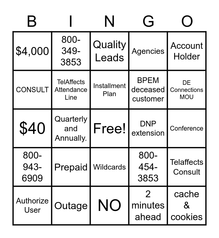This bingo card has a free space and 24 words: Prepaid, Outage, Installment Plan, Authorize User, Account Holder, $4,000, CONSULT, 800-349-3853, DNP extension, Wildcards, BPEM deceased customer, $40, 800-454-3853, Telaffects Consult, TelAffects Attendance Line, 2 minutes ahead, Conference, Quality Leads, DE Connections MOU, Quarterly and Annually., cache & cookies, 800-943-6909, Agencies and NO.