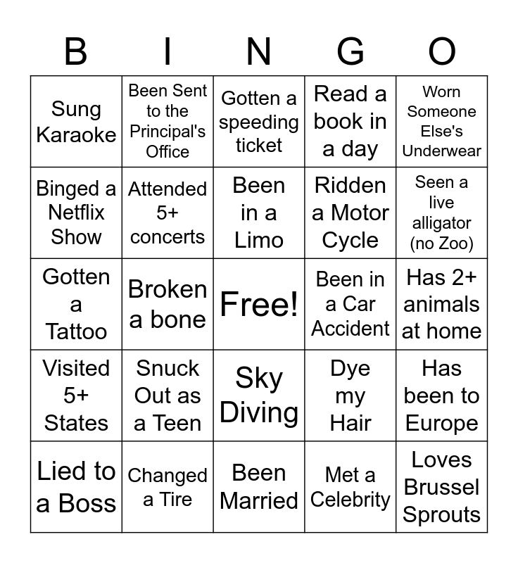 This bingo card has a free space and 24 words: Snuck Out as a Teen, Changed a Tire, Been in a Limo, Lied to a Boss, Worn Someone Else's Underwear, Sung Karaoke, Binged a Netflix Show, Been Sent to the Principal's Office, Been in a Car Accident, Sky Diving, Ridden a Motor Cycle, Gotten a Tattoo, Dye my Hair, Has been to Europe, Attended 5+ concerts, Met a Celebrity, Has 2+ animals at home, Gotten a speeding ticket, Seen a live alligator (no Zoo), Broken a bone, Loves Brussel Sprouts, Visited 5+ States, Read a book in a day and Been Married.