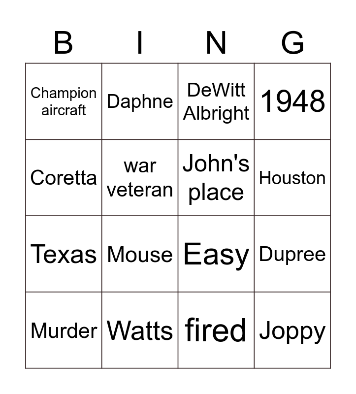 This bingo card has 17 words: Free!, Murder, Daphne, DeWitt Albright, Dupree, Coretta, Mouse, John's place, Houston, Texas, Watts, Easy, 1948, Champion aircraft, war veteran, fired and Joppy.