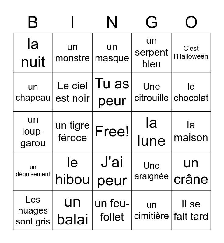 This bingo card has a free space and 39 words: Les sorcières, le soir, Les fantômes, Le ciel est noir, Les nuages sont gris, J'ai peur, Tu as peur, Les méchants esprits, C'est l'Halloween, un déguisement, un tigre féroce, un serpent bleu, Il se fait tard, la maison, la lune, le hibou, les chauves-souris, la nuit, des bonbons, Une araignée, un chapeau, un feu-follet, Une citrouille, le chocolat, le 31 octobre, des bonbons ou un sort!, un chat noir, un squelette, un momie, un monstre, un vampire, sculpter une citrouille, un masque, un balai, un cimitière, Une maison hantée, un crâne, un loup-garou and un zombie.