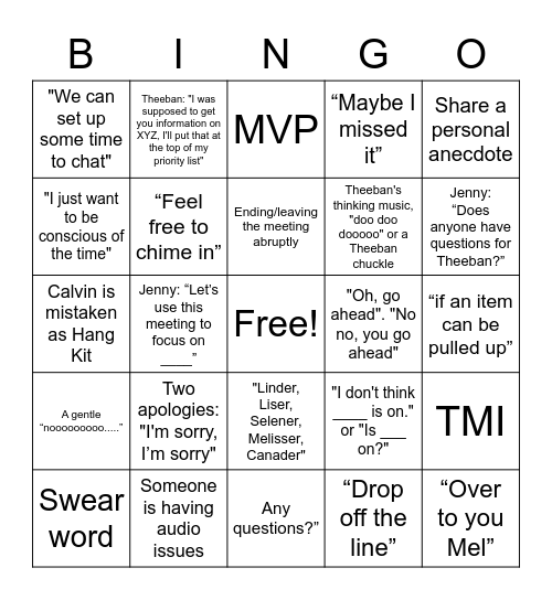 This bingo card has a free space and 24 words: Two apologies: "I'm sorry, I’m sorry", Someone is having audio issues, Ending/leaving the meeting abruptly, Swear word, Share a personal anecdote, "We can set up some time to chat", "I just want to be conscious of the time", Theeban: "I was supposed to get you information on XYZ, I'll put that at the top of my priority list", "Oh, go ahead". "No no, you go ahead", "Linder, Liser, Selener, Melisser, Canader", Theeban's thinking music, "doo doo dooooo" or a Theeban chuckle, Calvin is mistaken as Hang Kit, "I don't think ____ is on." or "Is ___ on?", TMI, “Feel free to chime in”, “Drop off the line”, “if an item can be pulled up”, MVP, Jenny: “Does anyone have questions for Theeban?”, Jenny: “Let’s use this meeting to focus on ____”, “Over to you Mel”, A gentle “nooooooooo.....”, “Maybe I missed it” and Any questions?”.