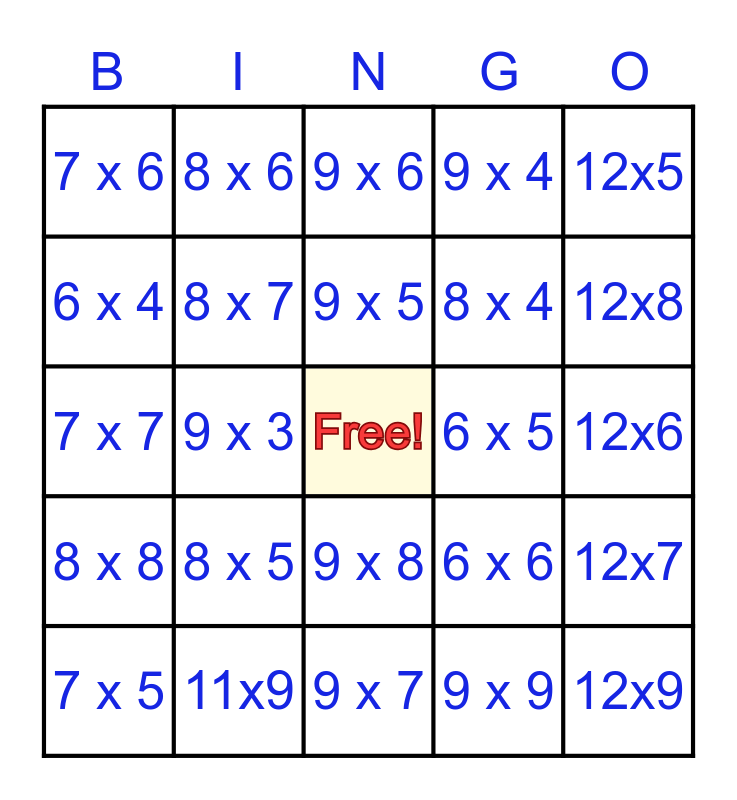 This bingo card has a free space and 24 words: 7 x 5, 8 x 5, 9 x 5, 9 x 9, 12x5, 7 x 6, 8 x 6, 9 x 6, 6 x 5, 12x6, 7 x 7, 8 x 7, 6 x 6, 12x7, 6 x 4, 11x9, 9 x 7, 9 x 4, 12x8, 8 x 8, 9 x 3, 9 x 8, 8 x 4 and 12x9.