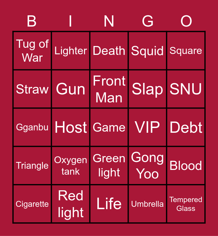 This bingo card has 40 words: Dalgona, Gganbu, Doll, Gun, Red light, Green light, Front Man, Circle, Square, Triangle, Host, Squid, Game, Debt, VIP, Oxygen tank, Marble, Tug of War, Rope, Death, Blood, Umbrella, Slap, Straw, Coffee, Card, 456 Billion Won, Winner, Tempered Glass, Time, Piggy bank, Cigarette, Easy money, Gong Yoo, SNU, Life, Invitation, Betrayal, Lighter and Mastermind.