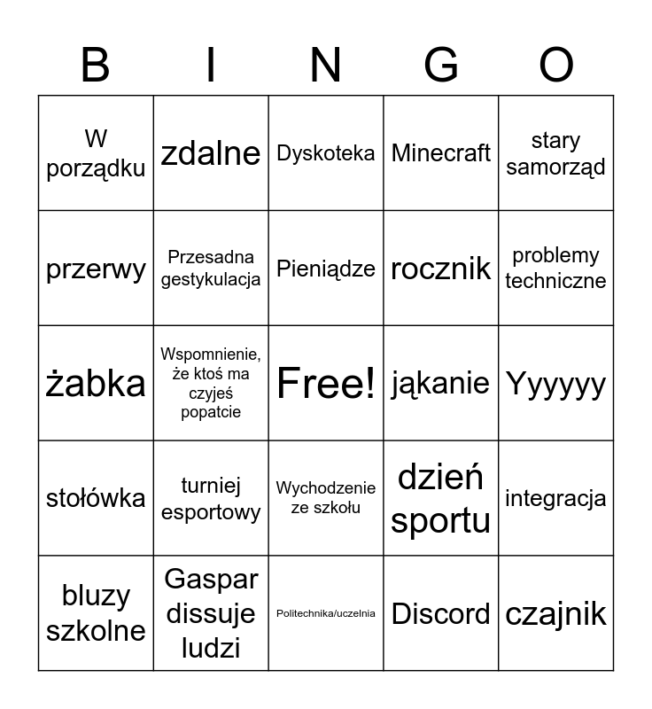 This bingo card has a free space and 24 words: turniej esportowy, Gaspar dissuje ludzi, Pieniądze, bluzy szkolne, stary samorząd, W porządku, przerwy, zdalne, jąkanie, Wychodzenie ze szkołu, rocznik, żabka, dzień sportu, integracja, Przesadna gestykulacja, Discord, Yyyyyy, Dyskoteka, problemy techniczne, Wspomnienie, że ktoś ma czyjeś popatcie, czajnik, stołówka, Minecraft and Politechnika/uczelnia.