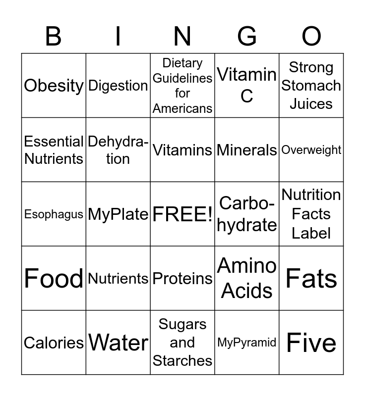 This bingo card has a free space and 24 words: Nutrients, Water, Vitamins, Calories, Strong Stomach Juices, Obesity, Essential Nutrients, Digestion, Carbo- hydrate, Proteins, Minerals, Esophagus, Amino Acids, Fats, Dehydra-tion, MyPyramid, Nutrition Facts Label, Dietary Guidelines for Americans, Overweight, MyPlate, Five, Food, Vitamin C and Sugars and Starches.