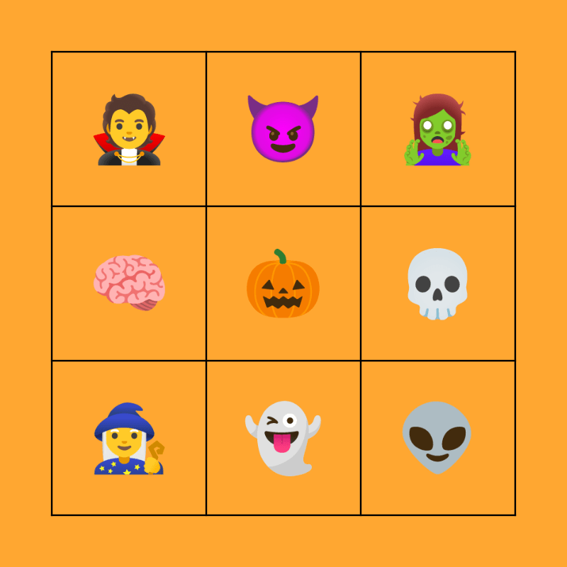 This bingo card has a free space and 8 words: 💀, 🧟♀️, 😈, 🧙♀️, 🧛, 👽, 🧠 and 👻.