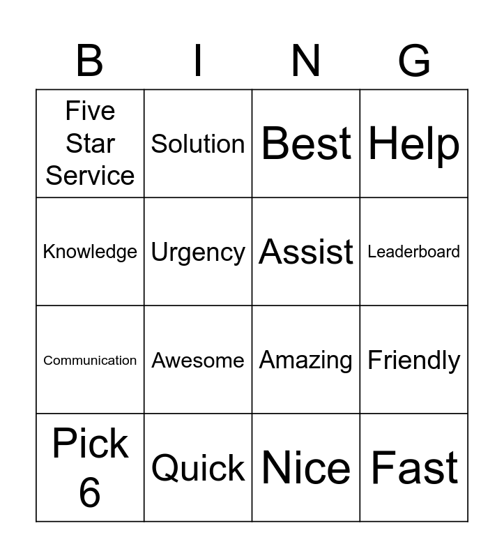 This bingo card has 16 words: Quick, Friendly, Best, Five Star Service, Communication, Solution, Amazing, Nice, Knowledge, Urgency, Pick 6, Help, Awesome, Leaderboard, Assist and Fast.