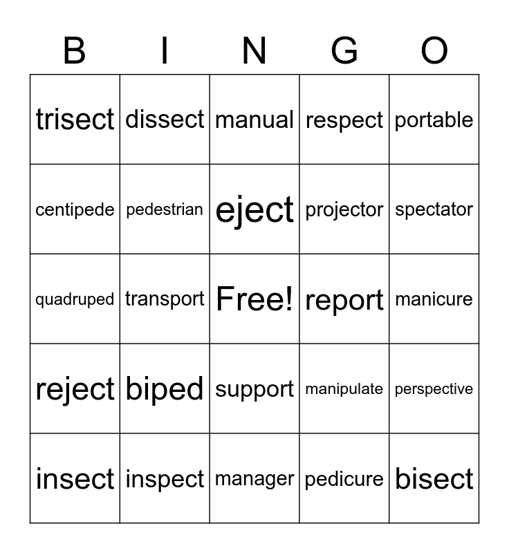 This bingo card has a free space and 24 words: biped, inspect, eject, insect, portable, trisect, centipede, dissect, report, support, projector, quadruped, manipulate, perspective, pedestrian, pedicure, manicure, manual, spectator, transport, bisect, reject, respect and manager.