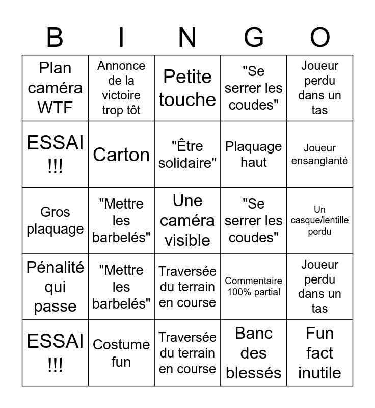 ⚠ This card has duplicate items: Plan caméra WTF (2), Costume fun (2), "Se serrer les coudes" (2), Fun fact inutile (2), ESSAI !!! (2), "Mettre les barbelés" (2), "Être solidaire" (2), Plaquage haut (2), Joueur ensanglanté (2), Gros plaquage (2), Carton (2), Petite touche (2), Commentaire 100% partial (2), Joueur perdu dans un tas (2), Pénalité qui passe (2), Traversée du terrain en course (2)