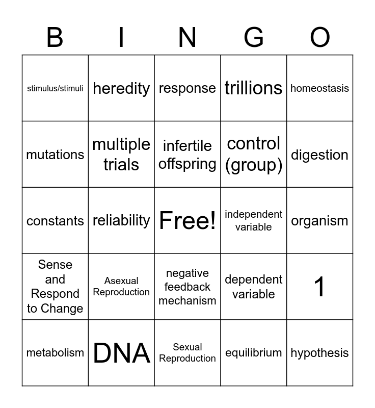 This bingo card has a free space and 25 words: Asexual Reproduction, Sexual Reproduction, infertile offspring, metabolism, homeostasis, stimulus/stimuli, mutations, heredity, independent variable, negative feedback mechanism, control (group), constants, dependent variable, 1, multiple trials, cells, organism, response, digestion, reliability, hypothesis, DNA, Sense and Respond to Change, trillions and equilibrium.