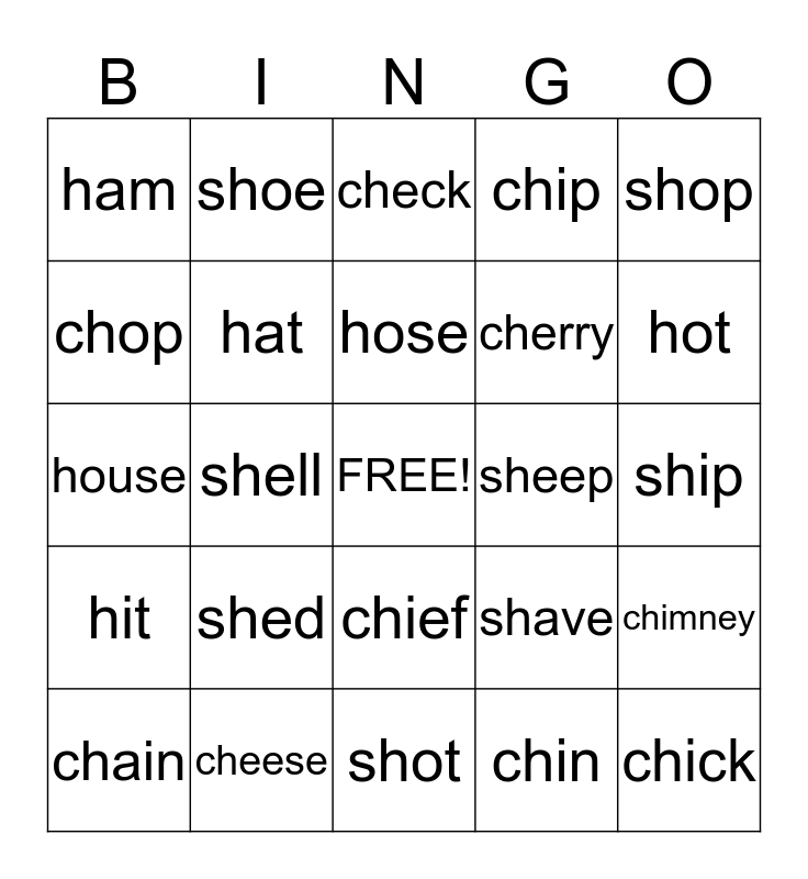 This bingo card has a free space and 24 words: shed, cheese, hose, chain, shop, ham, chop, shoe, sheep, chief, cherry, house, shave, chimney, hat, chin, ship, check, hot, shell, chick, hit, chip and shot.