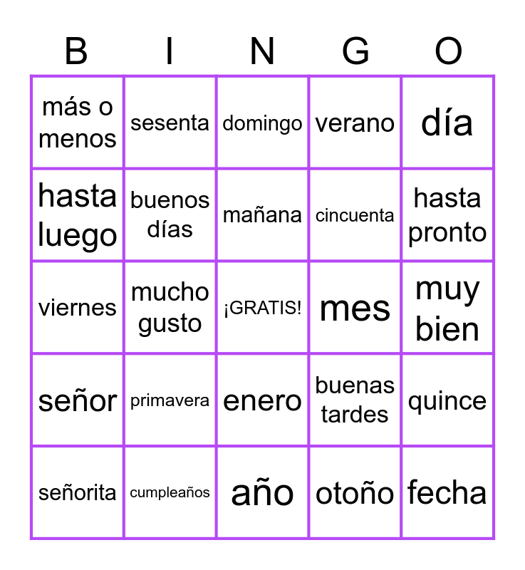 This bingo card has a free space and 48 words: setenta, fecha, buenas noches, año, primavera, igualmente, sesenta, cien, hasta luego, adiós, buenos días, verano, quince, buenas tardes, invierno, catorce, mañana, mes, bien, día, mucho gusto, otoño, más o menos, cincuenta, mal, hasta pronto, señorita, señora, enero, señor, hasta mañana, sí, si, Navidad, cumpleaños, semana, fin de semana, muy bien, muy mal, y, primero, martes, domingo, sábado, viernes, miércoles, lunes and jueves.