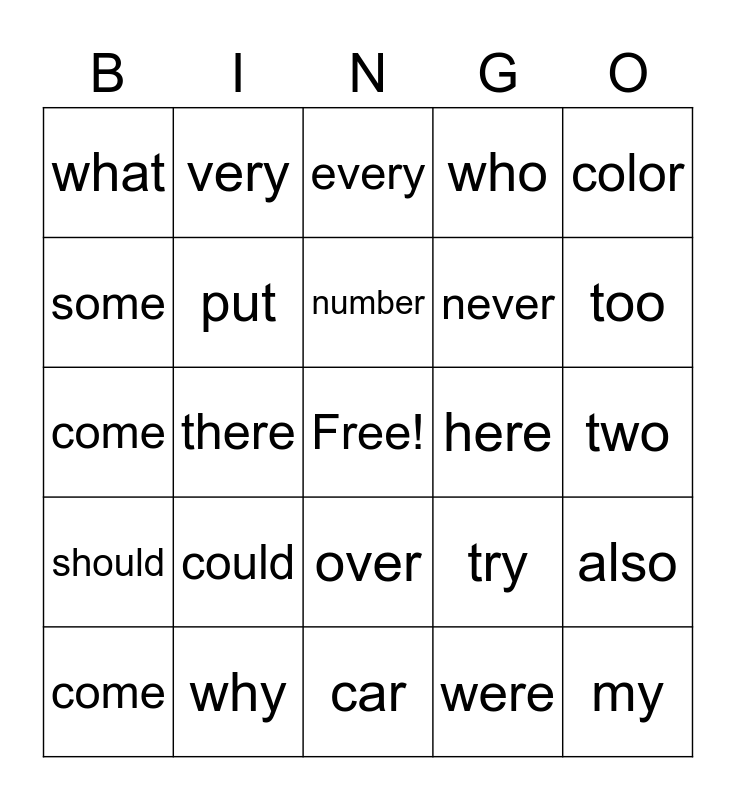This bingo card has a free space and 38 words: where, are, by, put, also, could, number, after, color, never, there, who, my, two, some, should, think, every, more, here, what, why, too, come, her, car, thank, thing, before, long, when, over, were, very, would, try, come and bring.