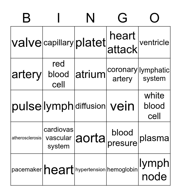 This bingo card has a free space and 24 words: cardiovas vascular system, heart, atrium, pacemaker, ventricle, valve, artery, capillary, vein, aorta, coronary artery, pulse, blood presure, plasma, red blood cell, hemoglobin, white blood cell, platet, lymphatic system, lymph, lymph node, atherosclerosis, heart attack and hypertension.