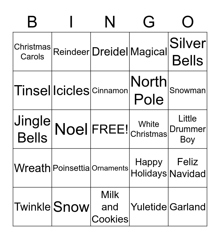 This bingo card has a free space and 24 words: Poinsettia, Snow, Cinnamon, Twinkle, Silver Bells, Christmas Carols, Tinsel, Reindeer, White Christmas, Ornaments, North Pole, Jingle Bells, Happy Holidays, Feliz Navidad, Icicles, Yuletide, Little Drummer Boy, Dreidel, Snowman, Noel, Garland, Wreath, Magical and Milk and Cookies.