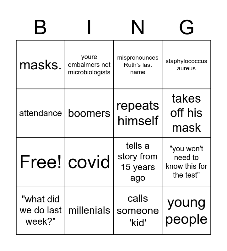 This bingo card has 20 words: "you won't need to know this for the test", "back in my day", mispronounces Ruth's last name, "we'll cover this later", "what did we do last week?", attendance, millenials, masks., Free!, youre embalmers not microbiologists, covid, tells a story from 15 years ago, boomers, young people, repeats himself, microbiology, takes off his mask, staphylococcus aureus, calls someone 'kid' and talks about his wife.
