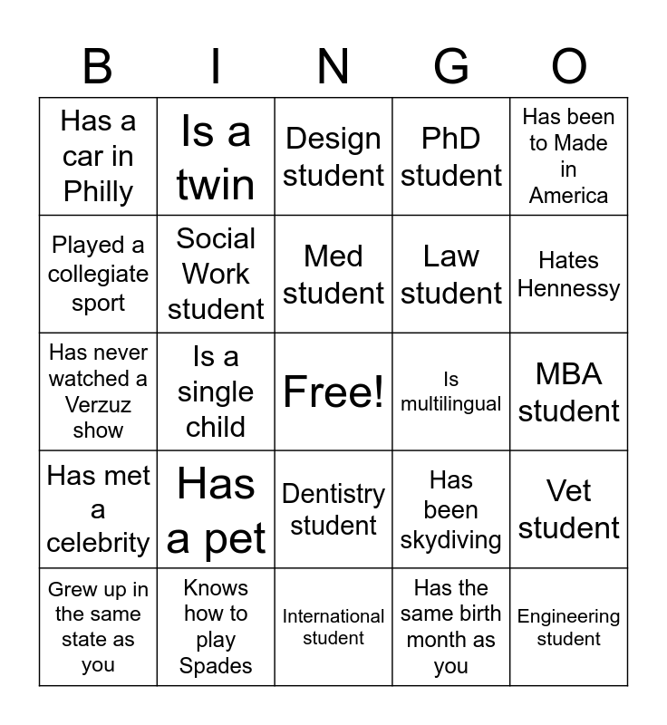 This bingo card has a free space and 24 words: Has a pet, Knows how to play Spades, Med student, Grew up in the same state as you, Has been to Made in America, Has a car in Philly, Played a collegiate sport, Is a twin, Is multilingual, Dentistry student, Law student, Has never watched a Verzuz show, Has been skydiving, Vet student, Social Work student, Has the same birth month as you, MBA student, Design student, Hates Hennessy, Is a single child, Engineering student, Has met a celebrity, PhD student and International student.