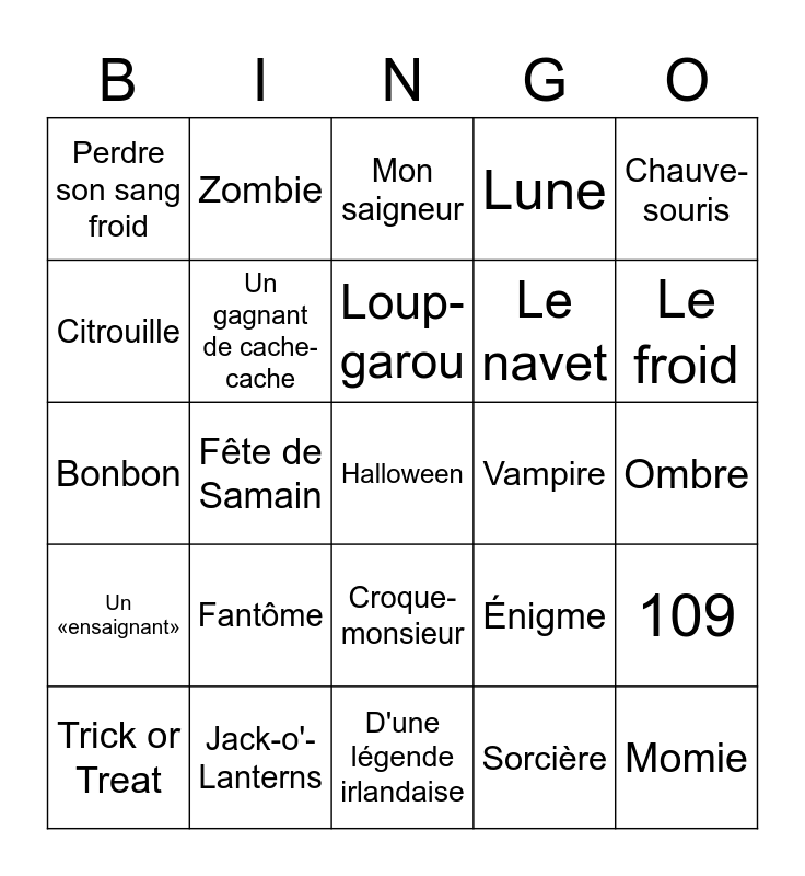 This bingo card has a free space and 24 words: Fantôme, Jack-o'-Lanterns, Loup-garou, Trick or Treat, Chauve-souris, Perdre son sang froid, Citrouille, Zombie, Vampire, Croque-monsieur, Le navet, Bonbon, Énigme, 109, Un gagnant de cache-cache, Sorcière, Ombre, Mon saigneur, Le froid, Fête de Samain, Momie, Un «ensaignant», Lune and D'une légende irlandaise.