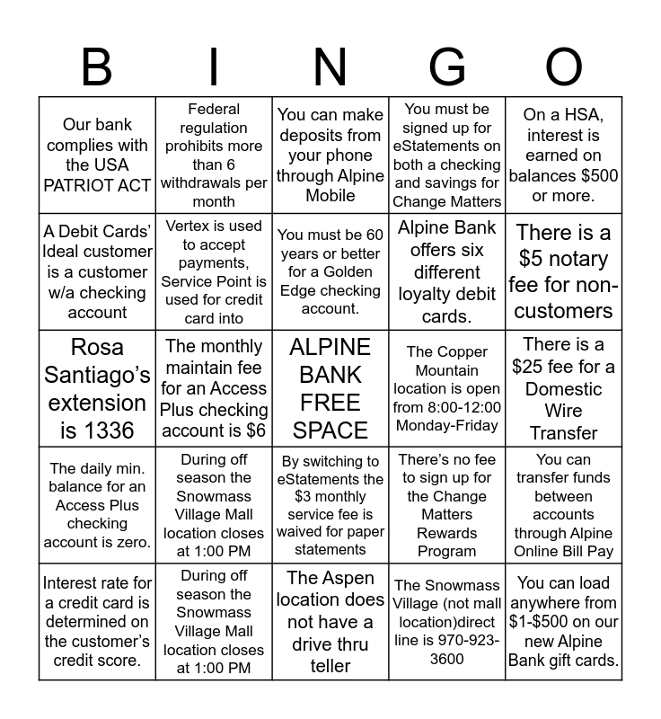 This bingo card has a free space and 24 words: During off season the Snowmass Village Mall location closes at 1:00 PM, During off season the Snowmass Village Mall location closes at 1:00 PM, You must be 60 years or better for a Golden Edge checking account., Interest rate for a credit card is determined on the customer’s credit score., On a HSA, interest is earned on balances $500 or more., Our bank complies with the USA PATRIOT ACT, A Debit Cards’ Ideal customer is a customer w/a checking account, Federal regulation prohibits more than 6 withdrawals per month, The Copper Mountain location is open from 8:00-12:00 Monday-Friday, By switching to eStatements the $3 monthly service fee is waived for paper statements, Alpine Bank offers six different loyalty debit cards., Rosa Santiago’s extension is 1336, There’s no fee to sign up for the Change Matters Rewards Program, You can transfer funds between accounts through Alpine Online Bill Pay, Vertex is used to accept payments, Service Point is used for credit card into, The Snowmass Village (not mall location)direct line is 970-923-3600, There is a $25 fee for a Domestic Wire Transfer, You can make deposits from your phone through Alpine Mobile, There is a $5 notary fee for non-customers, The monthly maintain fee for an Access Plus checking account is $6, You can load anywhere from $1-$500 on our new Alpine Bank gift cards., The daily min. balance for an Access Plus checking account is zero., You must be signed up for eStatements on both a checking and savings for Change Matters and The Aspen location does not have a drive thru teller.