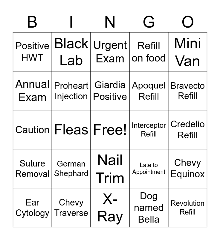 This bingo card has a free space and 24 words: German Shephard, Chevy Traverse, Giardia Positive, Ear Cytology, Mini Van, Positive HWT, Annual Exam, Black Lab, Interceptor Refill, Nail Trim, Apoquel Refill, Caution, Late to Appointment, Chevy Equinox, Proheart Injection, Dog named Bella, Credelio Refill, Urgent Exam, Bravecto Refill, Fleas, Revolution Refill, Suture Removal, Refill on food and X-Ray.