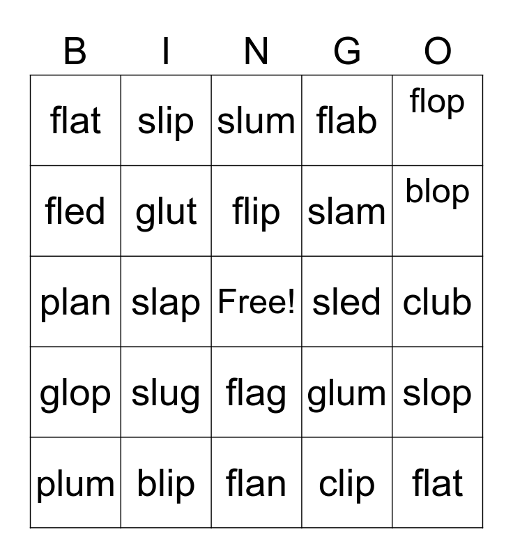 This bingo card has a free space and 24 words: slug, blip, flip, plum, flop, flat, fled, slip, sled, flag, slam, plan, glum, slop, glut, clip, club, slum, blop, slap, flat, glop, flab and flan.