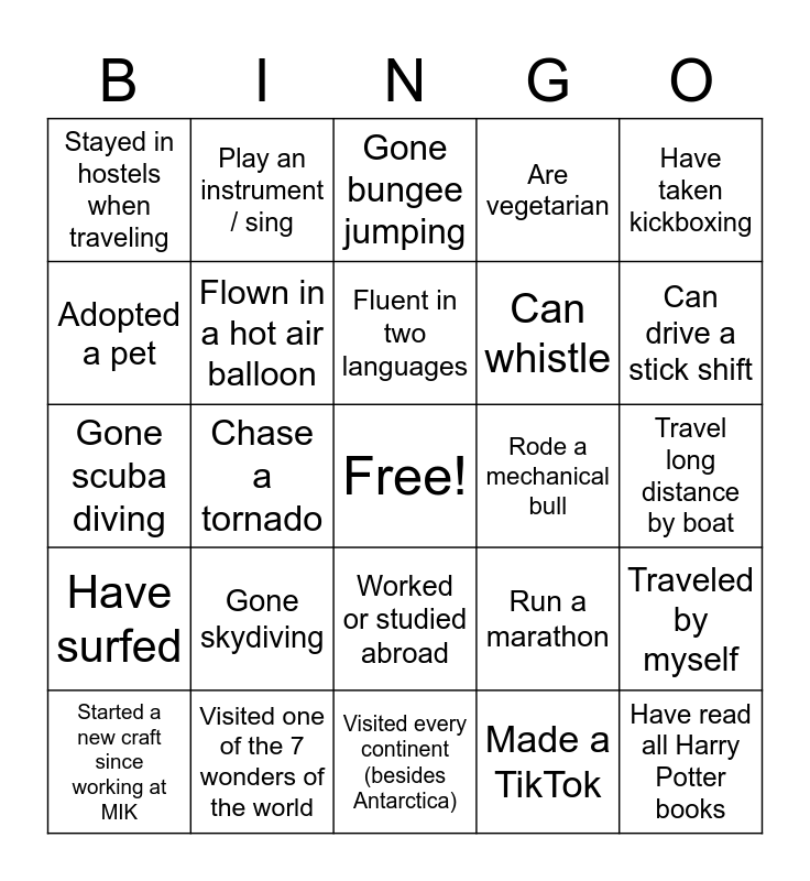 This bingo card has a free space and 24 words: Gone skydiving, Visited one of the 7 wonders of the world, Fluent in two languages, Started a new craft since working at MIK, Have taken kickboxing, Stayed in hostels when traveling, Adopted a pet, Play an instrument / sing, Rode a mechanical bull, Worked or studied abroad, Can whistle, Gone scuba diving, Run a marathon, Traveled by myself, Flown in a hot air balloon, Made a TikTok, Travel long distance by boat, Gone bungee jumping, Can drive a stick shift, Chase a tornado, Have read all Harry Potter books, Have surfed, Are vegetarian and Visited every continent (besides Antarctica).