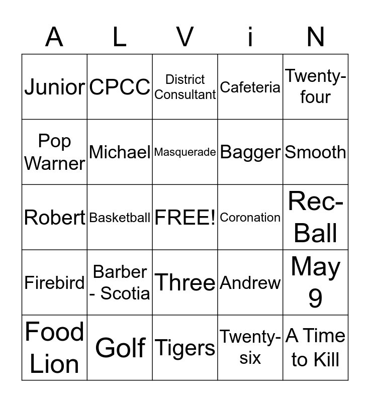 This bingo card has a free space and 24 words: Barber - Scotia, Golf, Masquerade, Food Lion, Twenty-four, Junior, Pop Warner, CPCC, Coronation, Three, Bagger, Robert, Andrew, May 9, Michael, Twenty-six, Rec-Ball, District Consultant, Smooth, Basketball, A Time to Kill, Firebird, Cafeteria and Tigers.