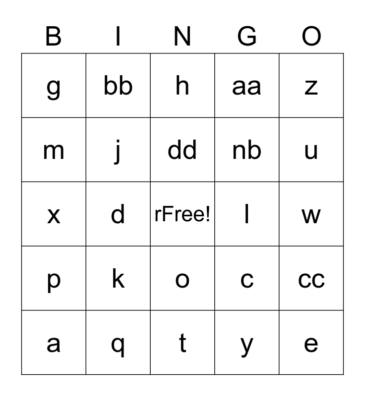 This bingo card has a free space and 29 words: a, b, d, f, g, h, j, k, l, q, w, e, t, y, u, i, o, p, z, x, c, v, nb, m, aa, bb, cc, dd and ee.