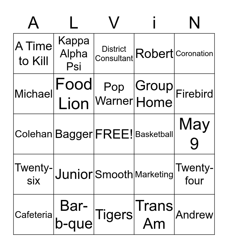 This bingo card has a free space and 37 words: Barber - Scotia, Golf, Masquerade, Food Lion, Twenty-four, Junior, Pop Warner, CPCC, Coronation, Three, Bagger, Robert, Andrew, May 9, Michael, Twenty-six, Rec-Ball, District Consultant, Smooth, Basketball, A Time to Kill, Firebird, Cafeteria, Tigers, Sabers, Trans Am, Kappa Alpha Psi, Football, Linebacker, Forward, Red Velvet, Bar-b-que, Colehan, Swansea, Marketing, Group Home and Information Systems.