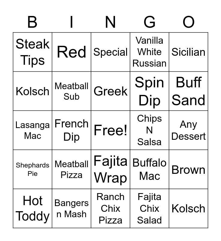 This bingo card has a free space and 24 words: Meatball Pizza, Bangers n Mash, Greek, Hot Toddy, Sicilian, Steak Tips, Kolsch, Red, Chips N Salsa, Fajita Wrap, Spin Dip, Lasanga Mac, Buffalo Mac, Brown, Meatball Sub, Fajita Chix Salad, Any Dessert, Special, Buff Sand, French Dip, Kolsch, Shephards Pie, Vanilla White Russian and Ranch Chix Pizza.