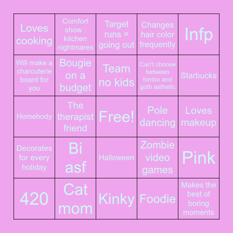 This bingo card has a free space and 24 words: Bi asf, Cat mom, Team no kids, 420, Infp, Loves cooking, Will make a charcuterie board for you, Comfort show : kitchen nightmares, Pole dancing, Halloween, Can't choose between bimbo and goth asthetic, Homebody, Zombie video games, Pink, Bougie on a budget, Foodie, Loves makeup, Target runs = going out, Starbucks, The therapist friend, Makes the best of boring moments, Decorates for every holiday, Changes hair color frequently and Kinky.