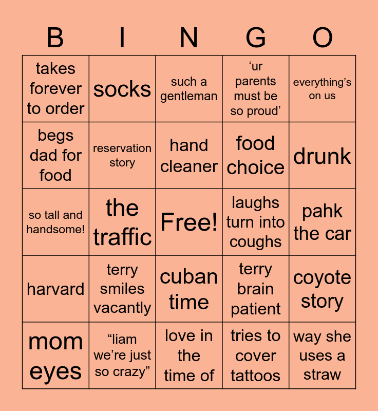 This bingo card has a free space and 24 words: terry smiles vacantly, “liam we’re just so crazy”, hand cleaner, mom eyes, everything’s on us, takes forever to order, begs dad for food, socks, laughs turn into coughs, cuban time, food choice, so tall and handsome!, terry brain patient, coyote story, reservation story, tries to cover tattoos, pahk the car, such a gentleman, drunk, the traffic, way she uses a straw, harvard, ‘ur parents must be so proud’ and love in the time of.