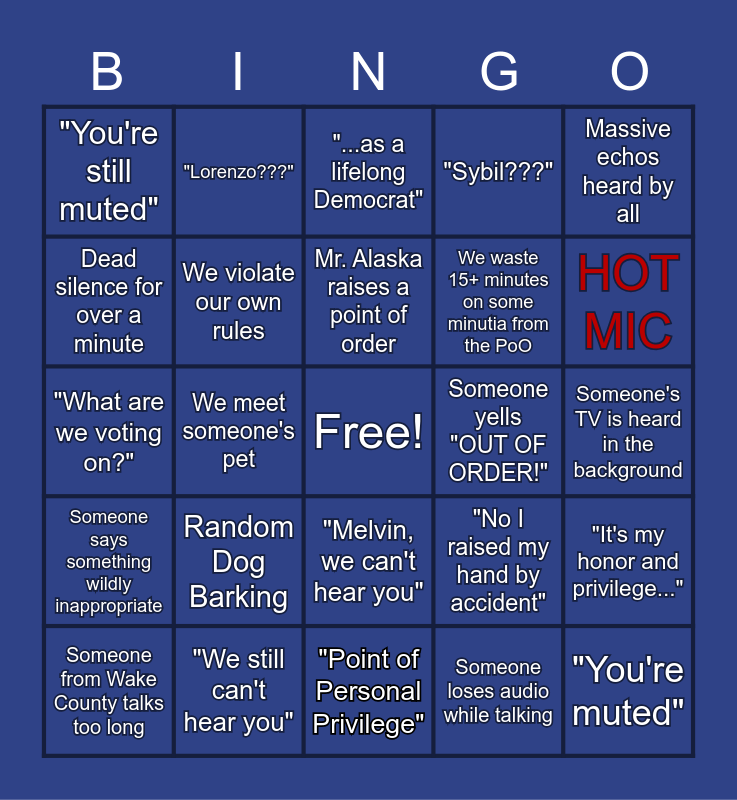This bingo card has a free space and 24 words: Random Dog Barking, "We still can't hear you", Mr. Alaska raises a point of order, Someone from Wake County talks too long, Massive echos heard by all, "You're still muted", Dead silence for over a minute, "Lorenzo???", Someone yells "OUT OF ORDER!", "Melvin, we can't hear you", We waste 15+ minutes on some minutia from the PoO, "What are we voting on?", "No I raised my hand by accident", "It's my honor and privilege...", We violate our own rules, Someone loses audio while talking, Someone's TV is heard in the background, "...as a lifelong Democrat", HOT MIC, We meet someone's pet, "You're muted", Someone says something wildly inappropriate, "Sybil???" and "Point of Personal Privilege".
