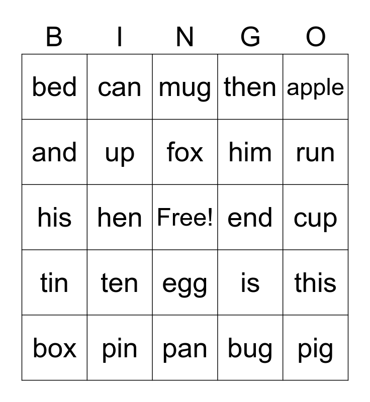 This bingo card has a free space and 24 words: ten, pin, fox, box, apple, bed, and, can, end, egg, him, his, is, this, up, bug, cup, mug, run, hen, pig, tin, then and pan.