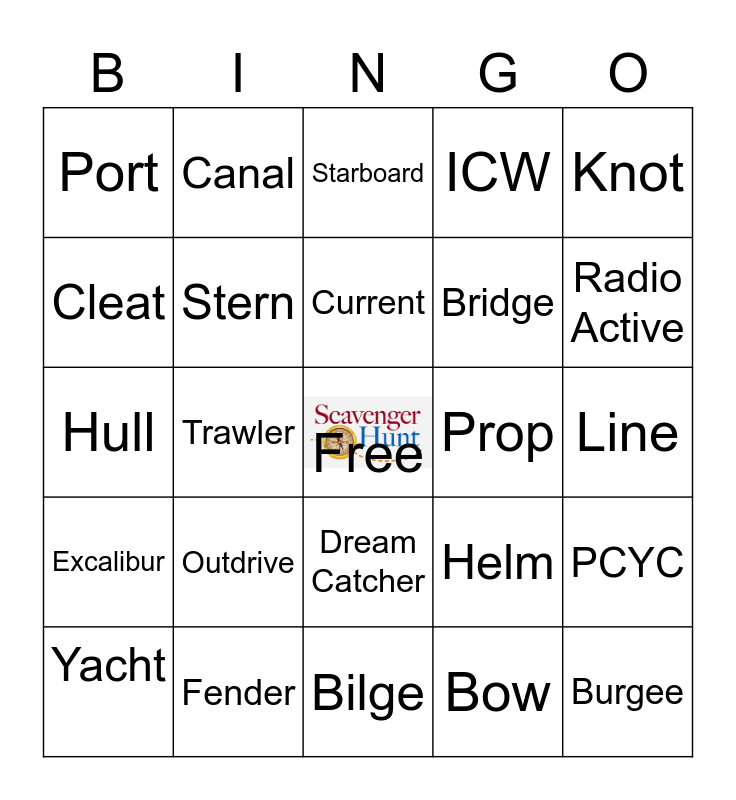 This bingo card has a free space and 29 words: Yacht, Anchor, Trawler, Sailboat, Port, Starboard, Stern, Outdrive, Prop, Fender, Line, Burgee, Bilge, Bow, Radio Active, Iffin, Dream Catcher, Excalibur, Knot, Hull, Helm, Wake, Bridge, Cleat, ICW, Canal, PCYC, Current and Picnic.