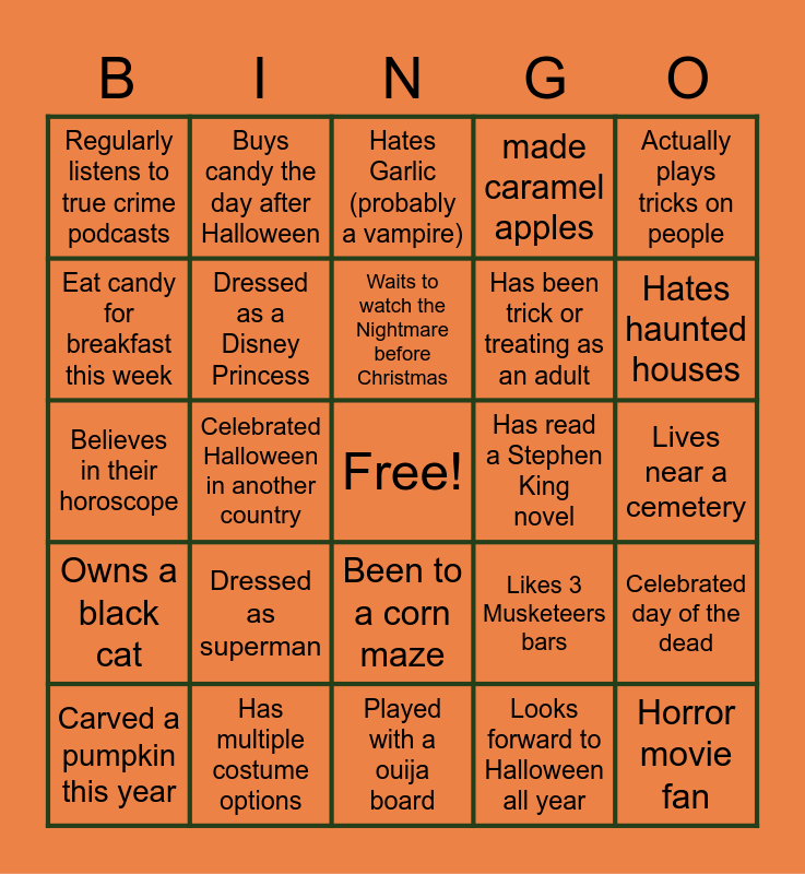 This bingo card has a free space and 31 words: Played with a ouija board, Can whip up a mean pumpkin pie, Celebrated Halloween in another country, Wore a pun Halloween Costume, Regularly listens to true crime podcasts, Hates Garlic (probably a vampire), Dressed as a Disney Princess, Likes 3 Musketeers bars, Has read a Stephen King novel, Looks forward to Halloween all year, Lives near a cemetery, Horror movie fan, Watched Hocus Pocus this month, Afraid of spiders, Hates haunted houses, Knows all the words to thriller, Celebrated day of the dead, Dressed as superman, Owns a black cat, Been to a corn maze, Actually plays tricks on people, Drank a pumpkin spice latte this month, Carved a pumpkin this year, Buys candy the day after Halloween, Has been trick or treating as an adult, Eat candy for breakfast this week, made caramel apples, Believes in their horoscope, Has multiple costume options, Waits to watch the Nightmare before Christmas and Picked out a pumpkin from a patch.