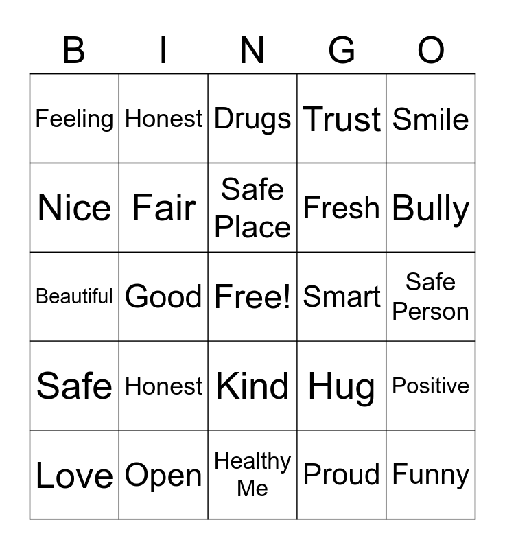 This bingo card has a free space and 25 words: Honest, Healthy Me, Safe Place, Love, Smile, Feeling, Nice, Honest, Smart, Kind, Fresh, Beautiful, Hug, Positive, Fair, Happy, Safe Person, Drugs, Bully, Good, Funny, Open, Safe, Trust and Proud.