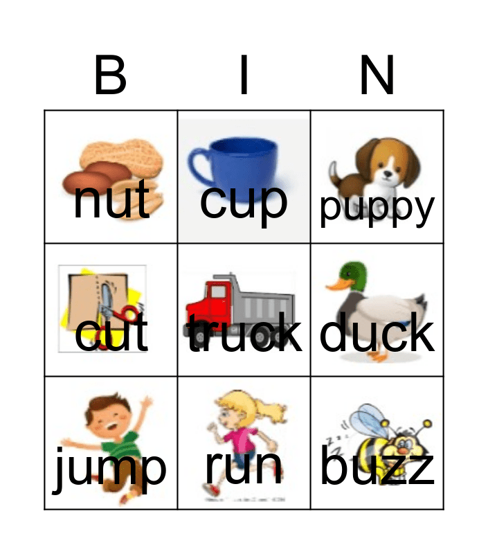 This bingo card has 11 images, a free space and 11 words: bug, run, buzz, jump, cup, puppy, duck, rug, cut, nut and sun.