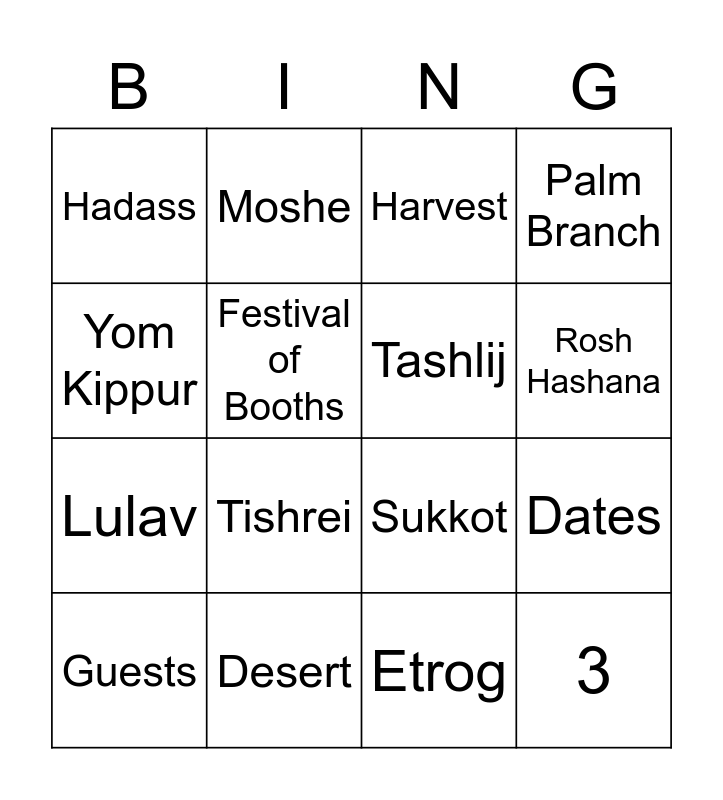 This bingo card has 16 words: Desert, Dates, Harvest, Hadass, Lulav, Moshe, Sukkot, Etrog, Yom Kippur, Festival of Booths, Guests, Palm Branch, Tishrei, Rosh Hashana, Tashlij and 3.
