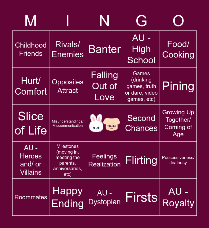 This bingo card has a free space and 24 words: Milestones (moving in, meeting the parents, anniversaries, etc), Happy Ending, Falling Out of Love, Roommates, Food/ Cooking, Childhood Friends, Hurt/ Comfort, Rivals/ Enemies, Second Chances, Feelings Realization, Games (drinking games, truth or dare, video games, etc), Slice of Life, Flirting, Possessiveness/ Jealousy, Opposites Attract, Firsts, Growing Up Together/ Coming of Age, Banter, Pining, Misunderstandings/ Miscommunication, AU - Royalty, AU - Heroes and/ or Villains, AU - High School and AU - Dystopian.